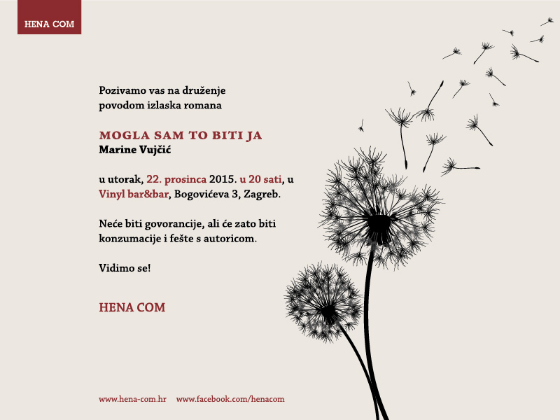 Izdavačka kuća HENA COM poziva Vas u petak, 18. prosinca 2015., u 20:00 sati u Vip club, Trg bana Josipa Jelačića 9, Zagreb