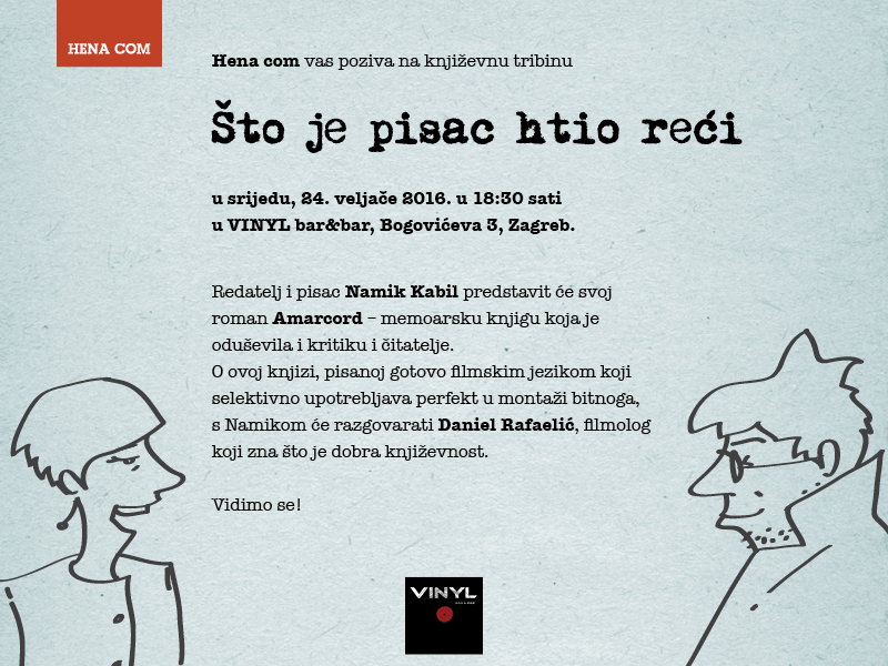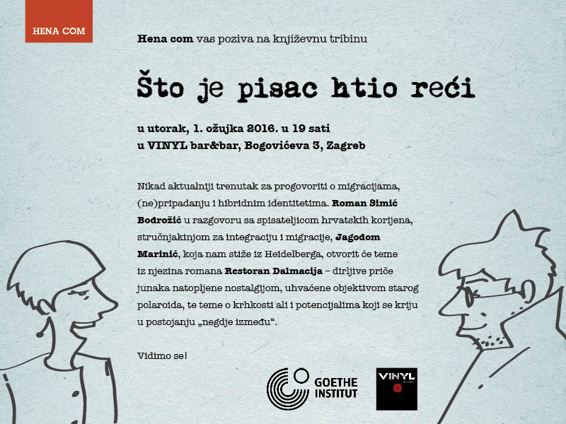 Hena com vas poziva na književnu tribinu u srijedu, 24. veljače 2016. u 18:30 sati u VINYL bar&bar, Bogovićeva 3, Zagreb.