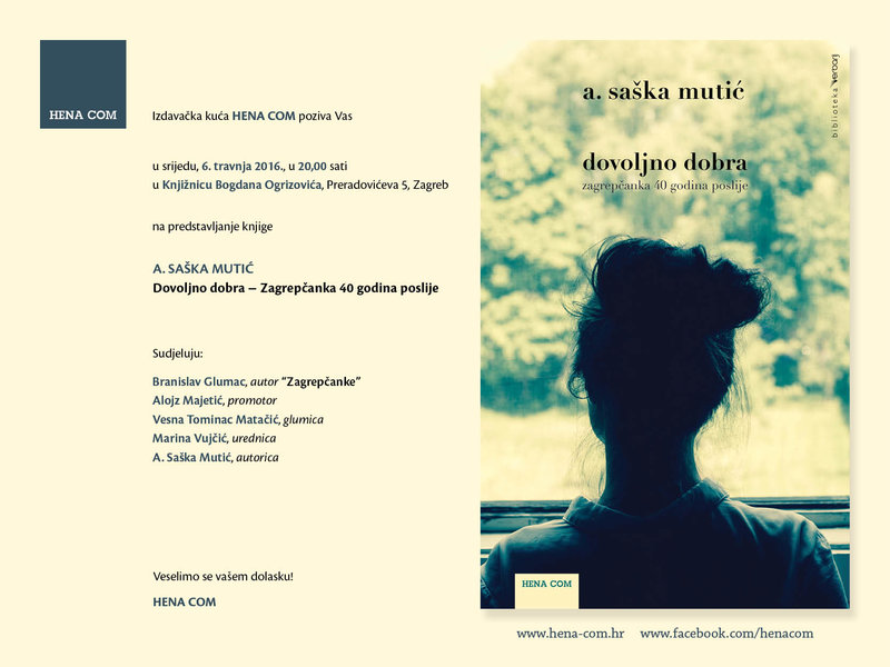 Izdavačka kuća HENA COM poziva Vas u srijedu, 6. travnja 2016., u 20:00 sati u Knjižnicu Bogdana Ogrizovića, Preradovićeva 5, Zagreb,