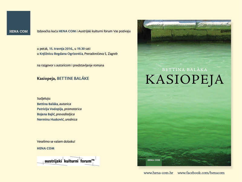 Izdavačka kuća Hena com i Austrijski kulturni forum Vas pozivaju u petak, 15. travnja 2016., u 19.30 sati u Knjižnicu Bogdana Ogrizovića, Preradovićeva 5, Zagreb na razgovor s autoricom i predstavljanje romana