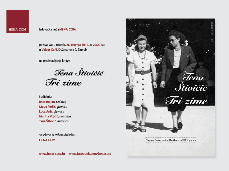 Izdavačka kuća HENA COM poziva Vas u utorak, 16. veljače 2016. u 19.30 sati u Knjižnicu i čitaonicu Bogdana Ogrizovića, Preradovićeva 5, Zagreb na predstavljanje knjige
