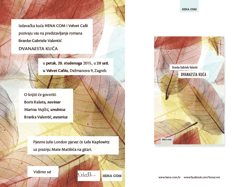 Izdavačka kuća HENA COM i Velvet cafe pozivaju vas na predstavljanje romana Branke Gabriele Valentić, "Dvanaesta kuća"