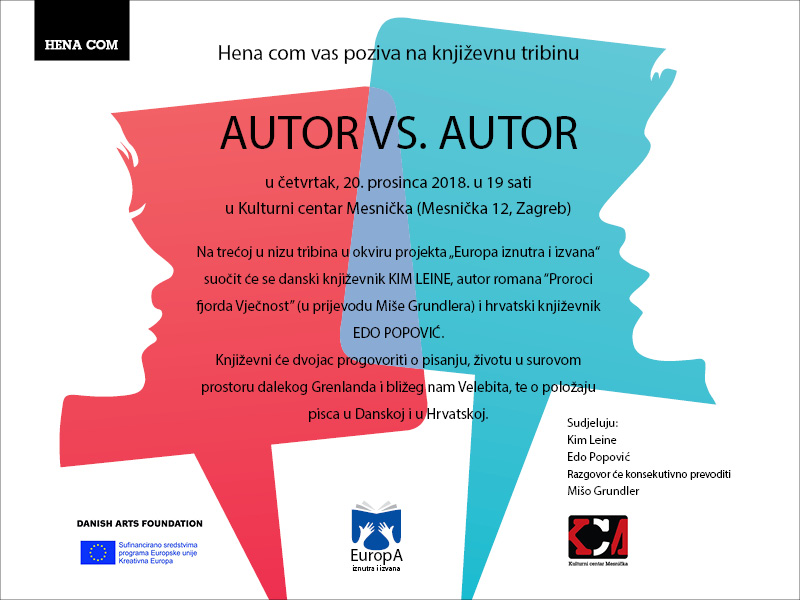Na trećoj u nizu tribina u okviru projekta „Europa iznutra i izvana“ suočit će se danski književnik KIM LEINE, autor romana „Proroci fjorda Vječnost“ i hrvatski književnik EDO POPOVIĆ.